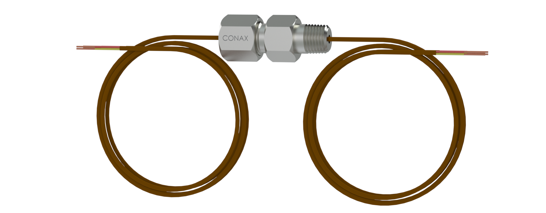 The assembly consists of magnesia alumina silicate vitreous fiber braided impregnated thermocouple grade wires on the body side, with stripped bare wires passing through the Conax-manufactured TG Feedthrough. Sleeved insulation material on the wires exiting the cap side may be fiberglass/silicone impregnated or polyolefin.